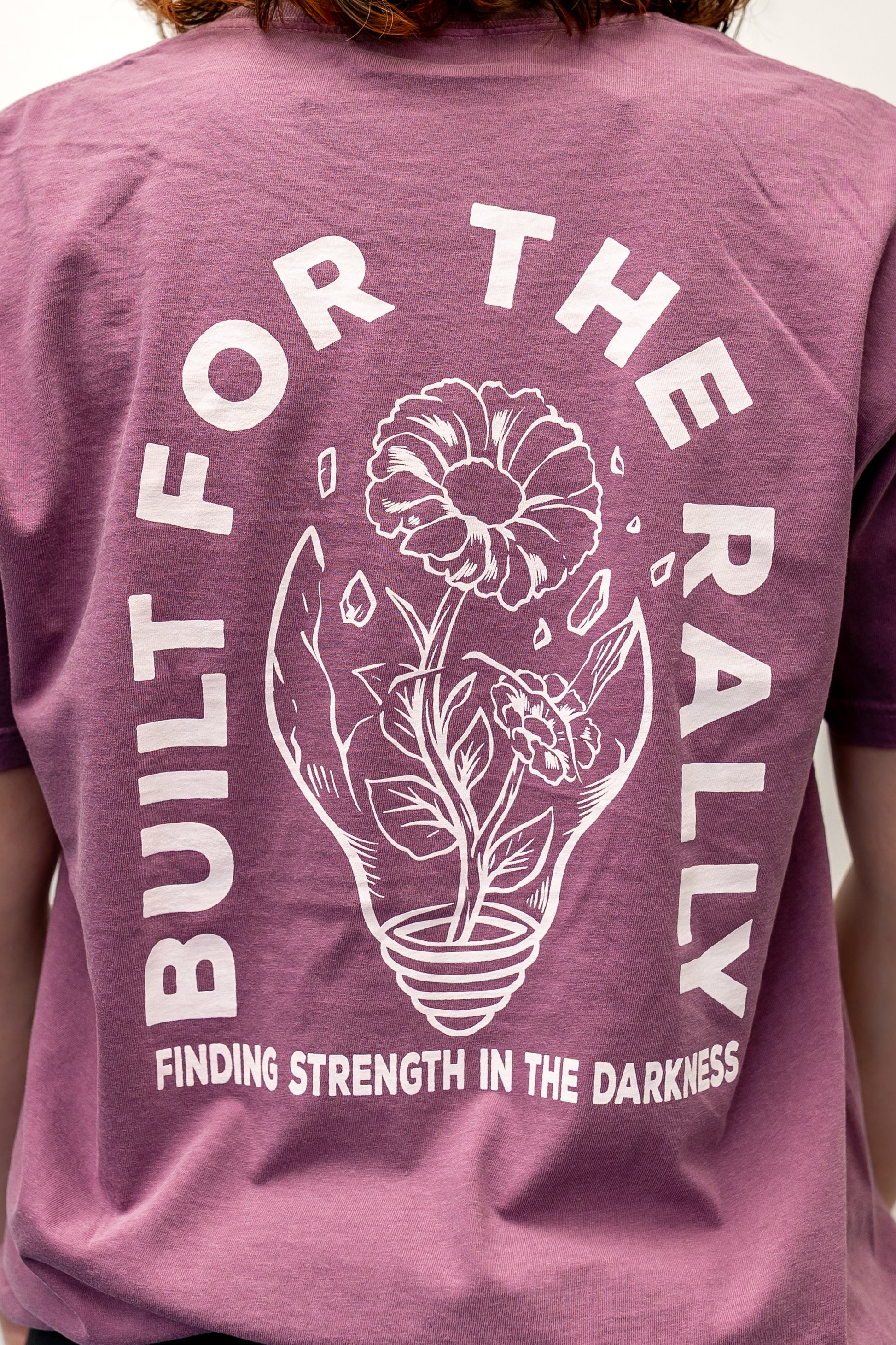 The back displays BUILT FOR THE RALLY with “Finding Strength in the Darkness,” while the front mirrors the bloom artwork with the DIG mantra.